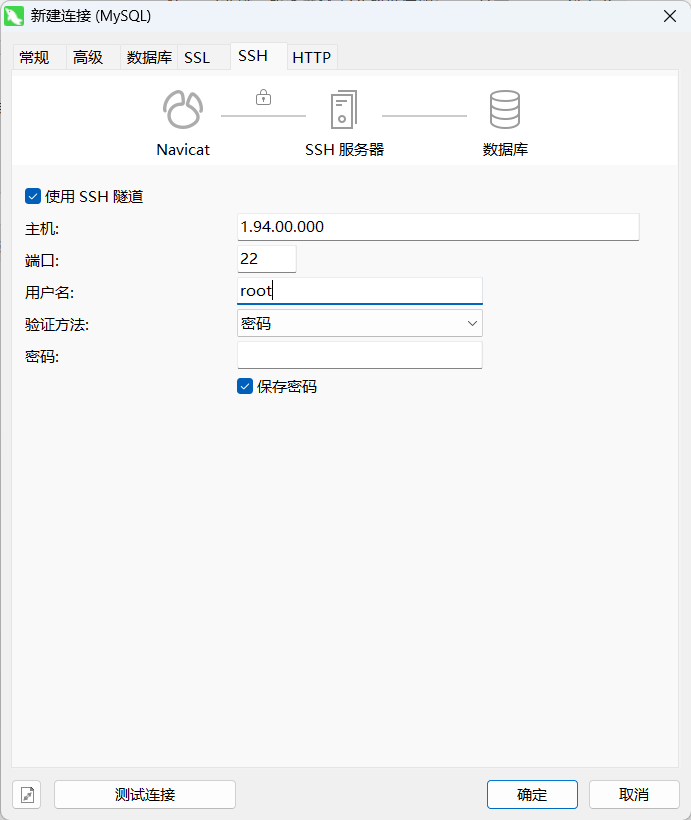 点击使用SSH隧道,然后主机是云服务器IP地址,端口号是固定的22,用户名和密码是云服务器的。